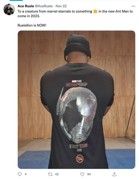 Dopo la conclusione della produzione del film, il membro della troupe Ace Ruele per Ant-Man and the Wasp: Quantumania ha condiviso su Twitter un’immagine della confezione regalo della squadra di stuntman. La T-shirt vede una versione danneggiata dell’elmo dell’eroe titolare con un riflesso di Kang il Conquistatore, offrendo il primo sguardo all’antagonista del film, anche se Ruele da allora ha cancellato il suo post. Guarda uno screenshot della confezione regalo qui sotto:
