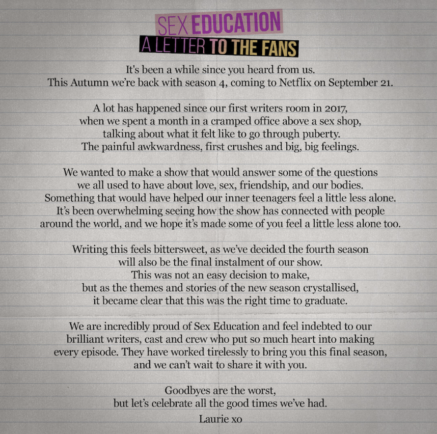 “Siamo incredibilmente orgogliosi di Sex Education e siamo in debito con il nostro fantastico team di sceneggiatori, attori e tutta la troupe che ha messo così tanto amore nel realizzare ogni episodio. Hanno lavorato in maniera instancabile per questa stagione finale, e non vediamo l’ora di condividerla con voi”.